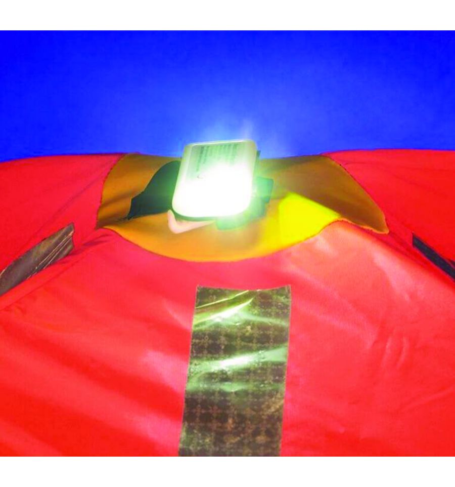 Le radeau est équipé d'une lampe extérieure 0,75 cd, à déclenchement automatique durant 12 heures, et de bandes rétro-réfléchissantes.