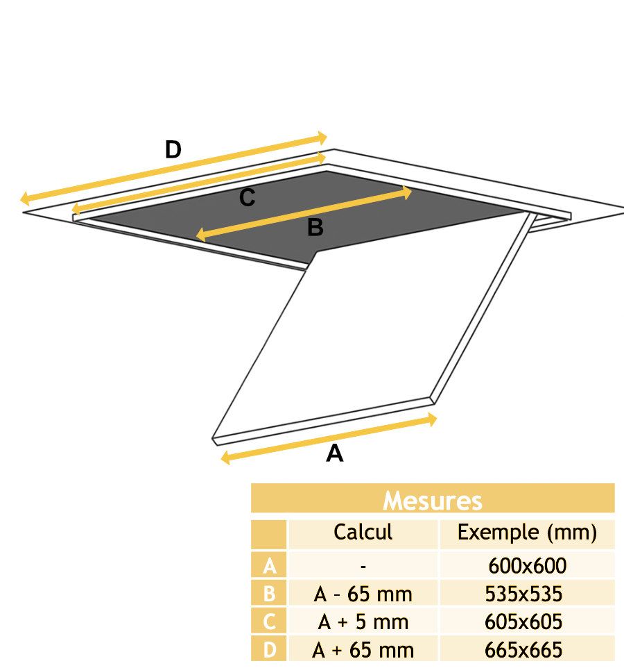 Afin de faire le bon choix de trappe de visite, il faut savoir de quelle ouverture vous disposez ou dont vous avez besoin. En effet, la taille de la trappe permettant l'accès aux gaines ou installation, ne correspond pas parfaitement à la même que l'ouverture réelle qu'il faudra réaliser pour installer le produit.