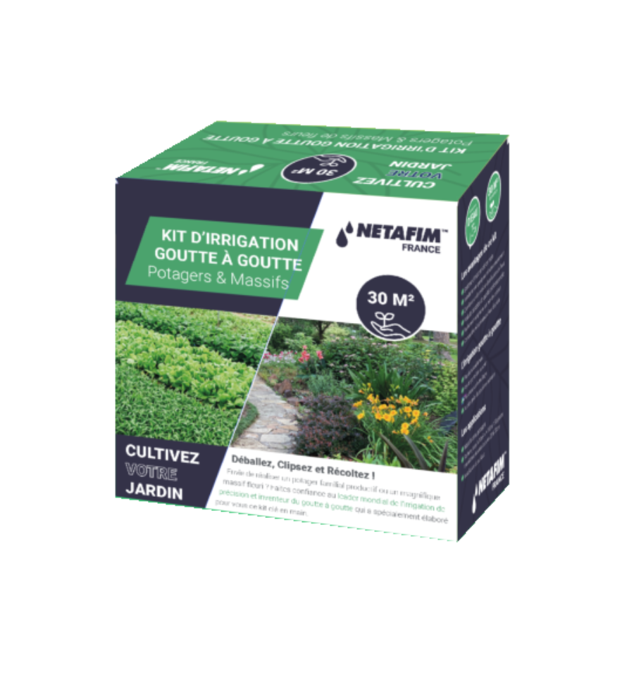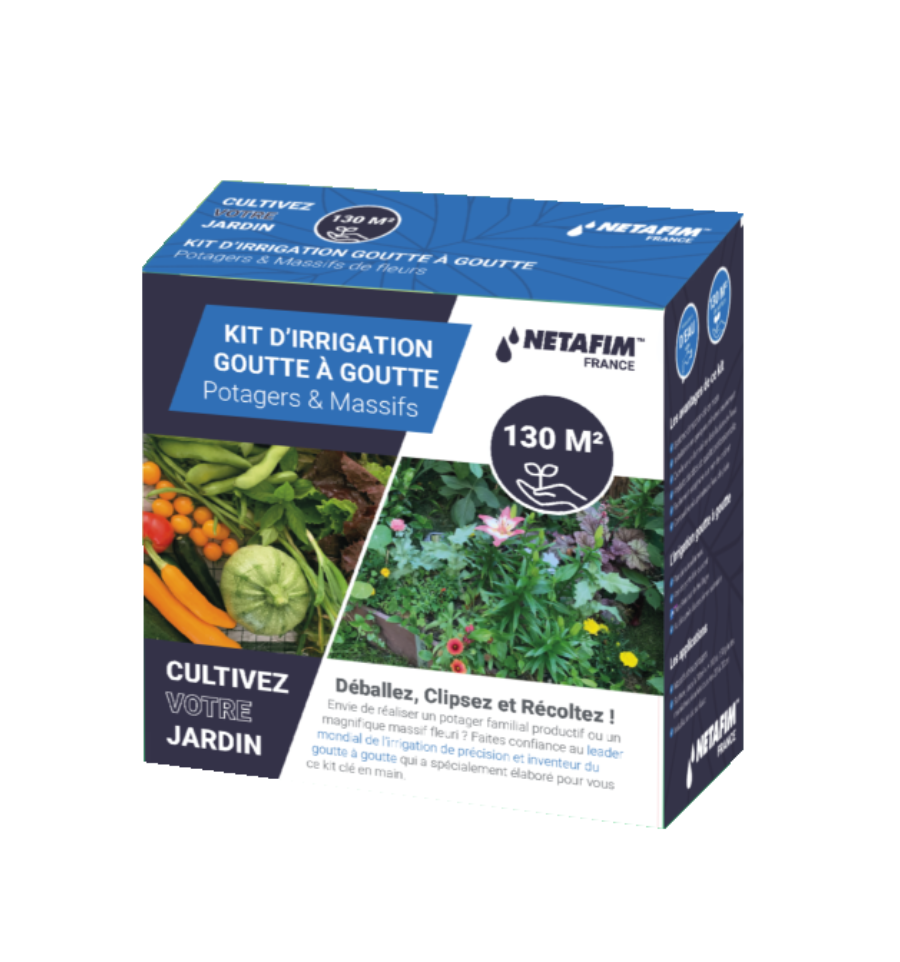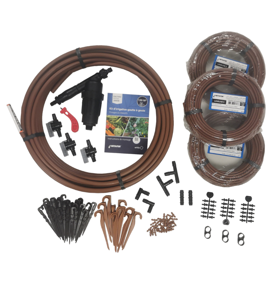 Ce kit d'arrosage goutte à goutte est un système d'irrigation clé en main disponible en version 30 m² pour les jardins ou 130 m² pour les surfaces agricoles par exemple.