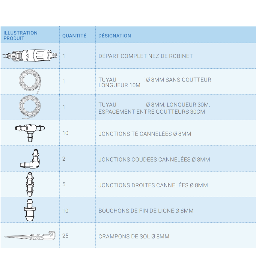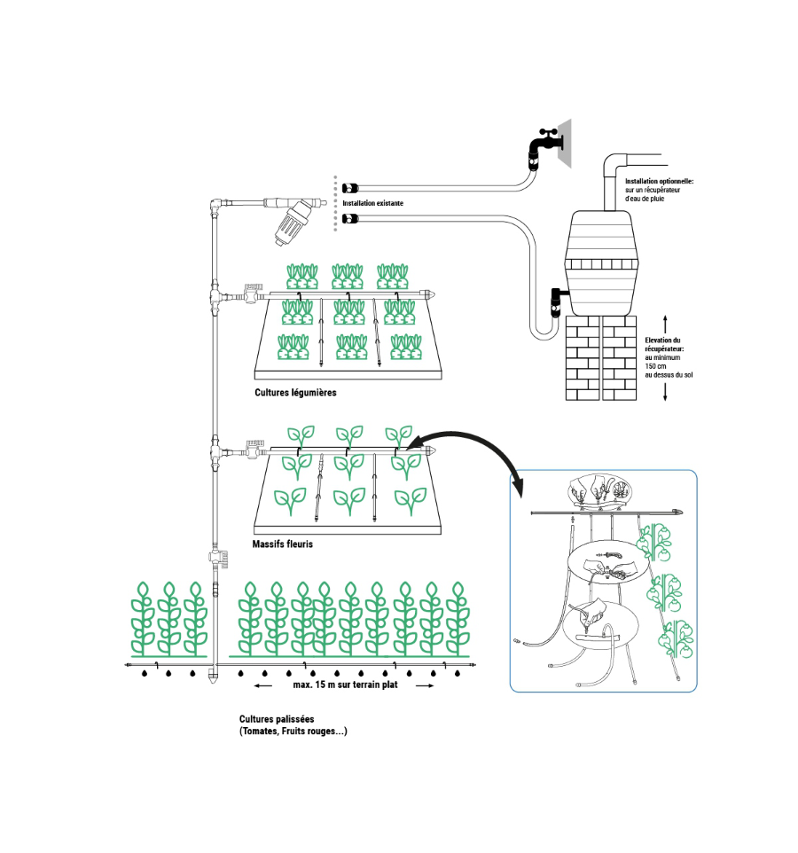 L'installation des kits d'arrosage de goutte à goutte est très simple. Vous pouvez télécharger la notice de montage que vous recevrez en même temps que la livraison du kit