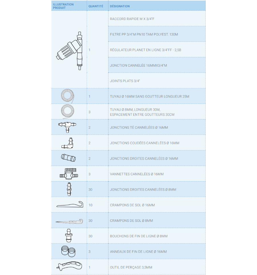 - 1 tuyau de 16 mm de diamètre sans goutteur de 25 m de longueur