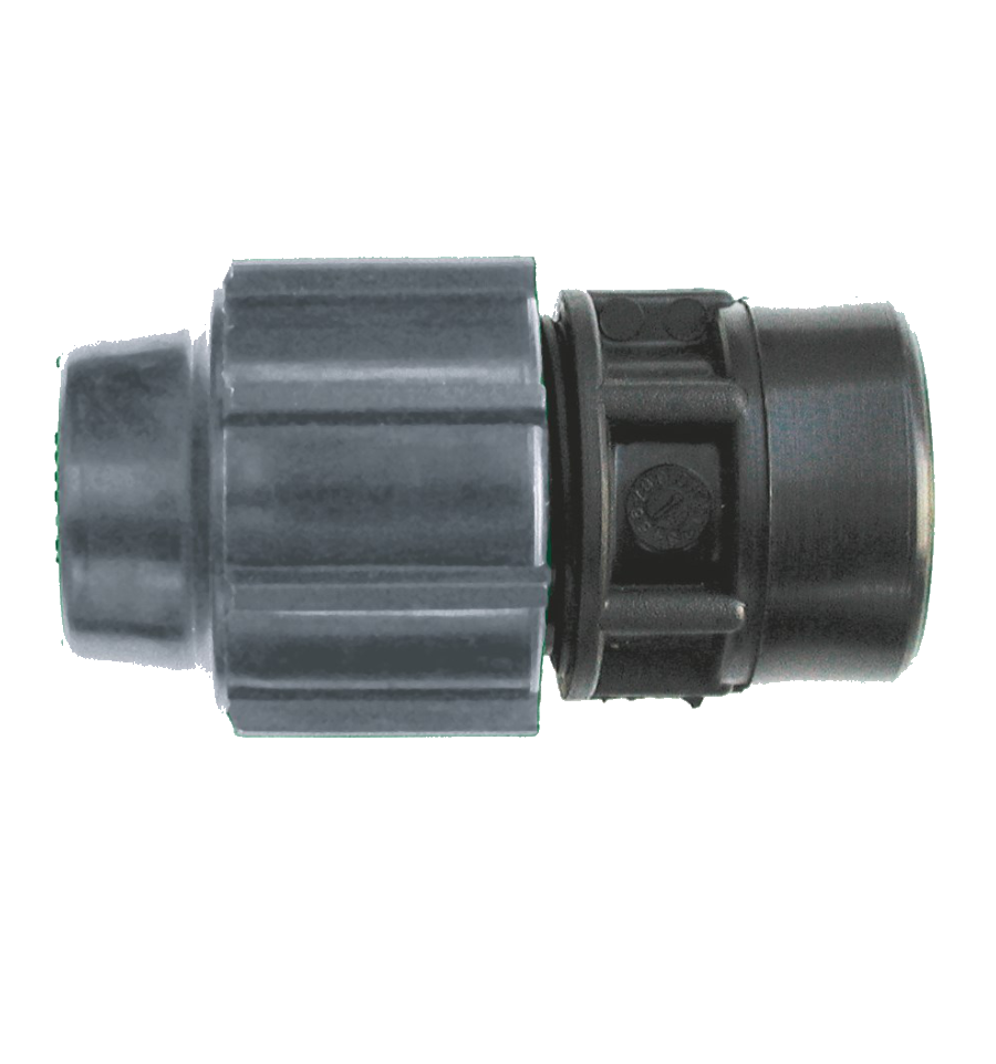 - Manchon femelle : Une extrémité reçoit un tuyau PE, l'autre possède un filetage femelle (intérieur) ce qui permet de raccorder un tuyau PE à un élément fileté mâle comme un raccord, un raccord té ou un accessoire d'arrosage mâle.