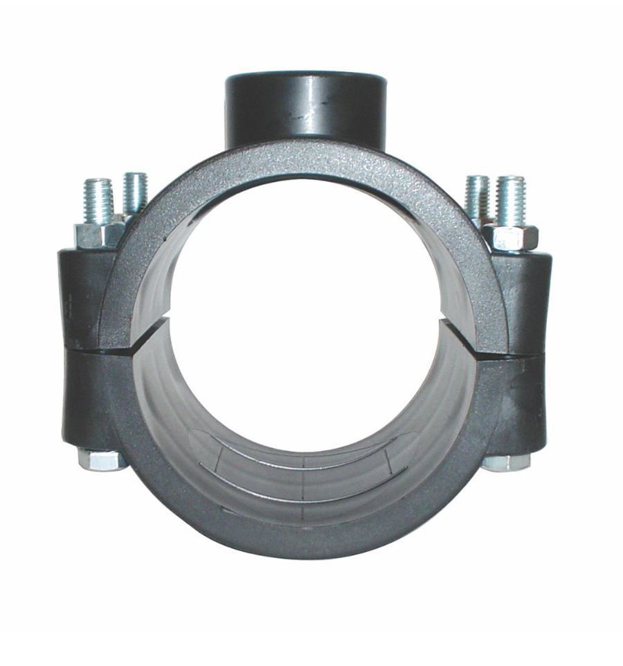 - Positionnez la première moitié (partie inférieure du collier de prise en charge) sous le tuyau, puis placez la seconde moitié sur le dessus, en vous assurant que le joint d'étanchéité est bien en place.