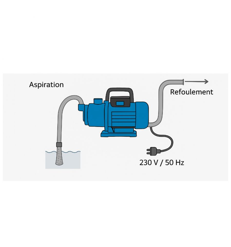 En effet, branchez la pompe à une alimentation de 230 V puis, puisez l'eau depuis un réservoir, un bassin ou un puits peu profond.