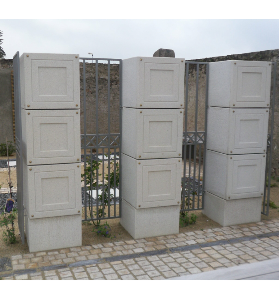 Les cases superposables permettent d'optimiser l'espace dans les cimetières. Ses dimensions sont : L. 49,5 x H. 150 cm x p. 50 cm et son poids total est de 441 kg.