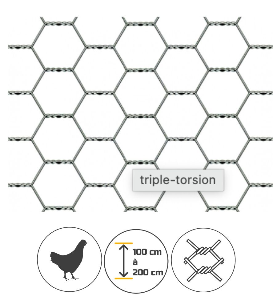 Optez pour notre grillage triple torsion, aussi appelé " grillage à poule professionnel " en acier galvanisé à chaud après torsion (garantissant ainsi une meilleure résistance à la corrosion).