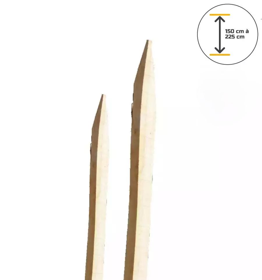 Le piquet est livré scié et écorcé et disponible dans différentes hauteurs allant de 150 cm à 225 cm. La circonférence du piquet est de 28/32 cm.