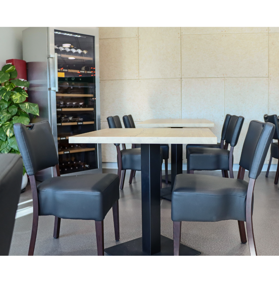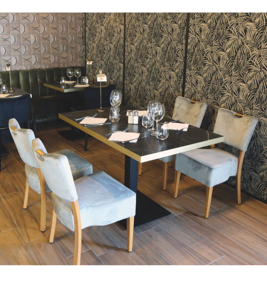 Son assise et son dossier tapissés, disponibles en imitation cuir noir ou velours gris, assurent un confort optimal pour vos clients.
