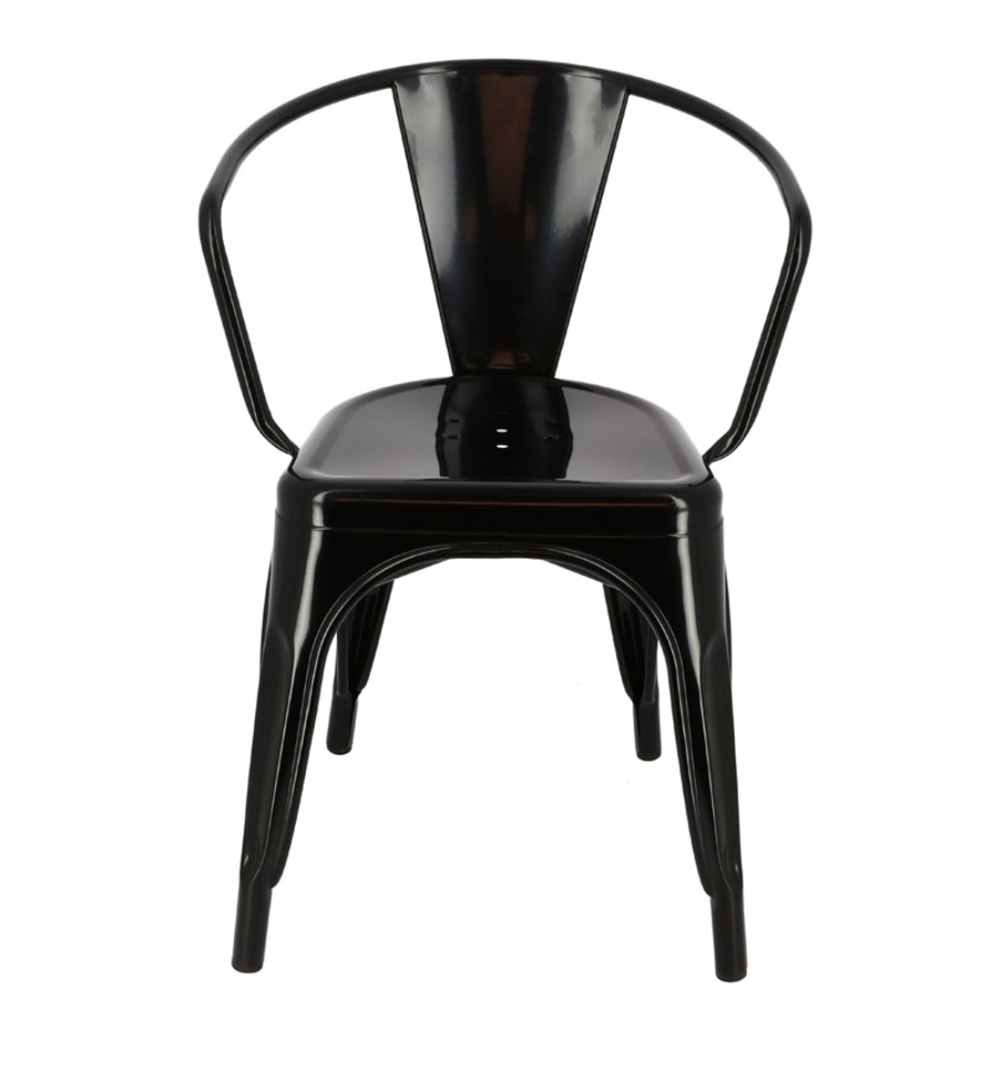 La chaise et le fauteuil industriels en métal ont une finition acier, protégée par un vernis transparent ou un vernis noir.