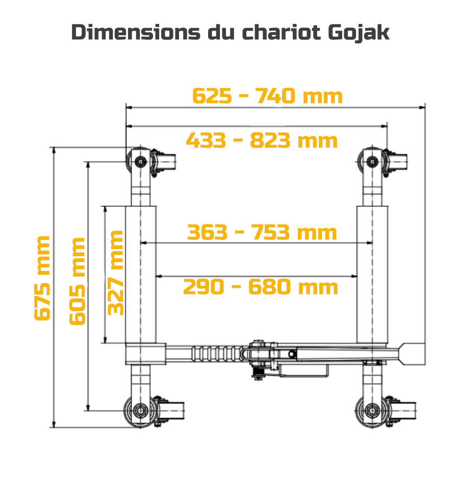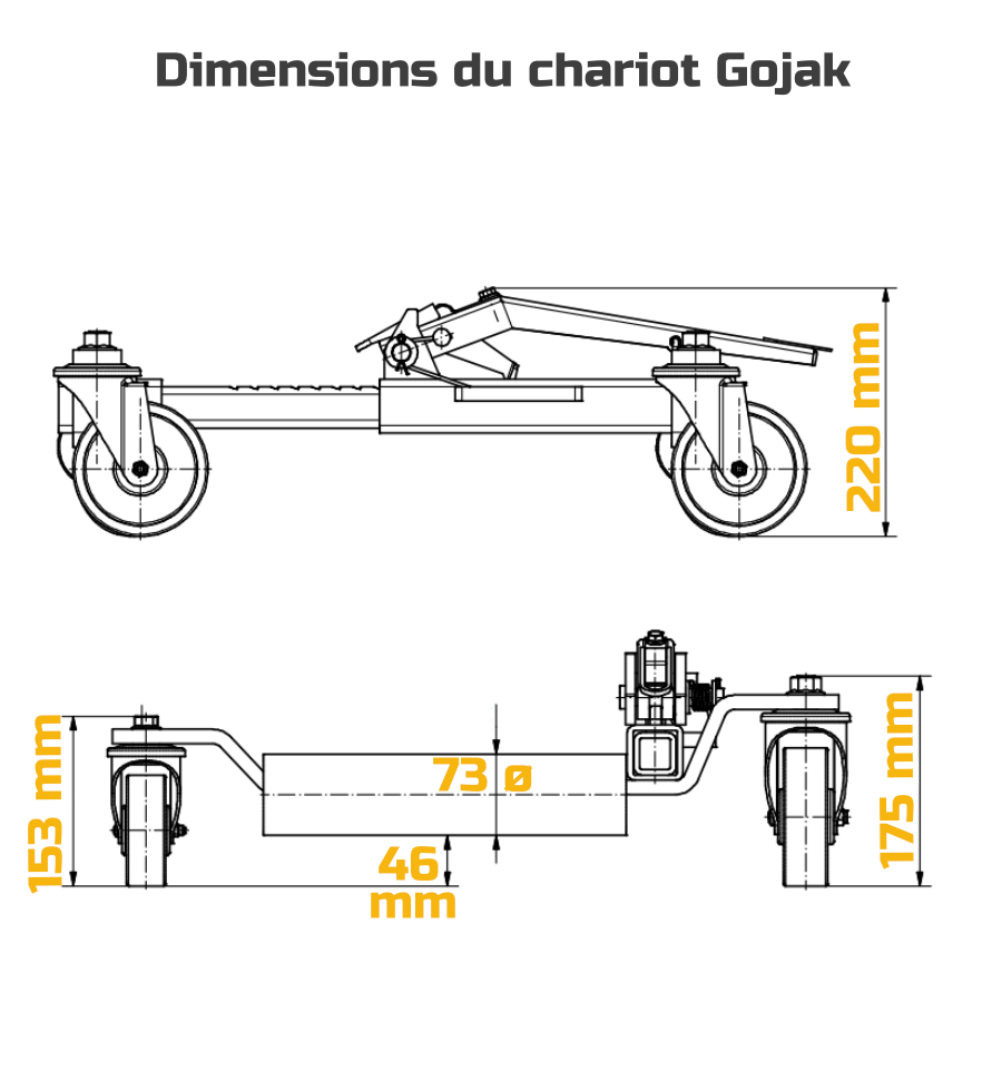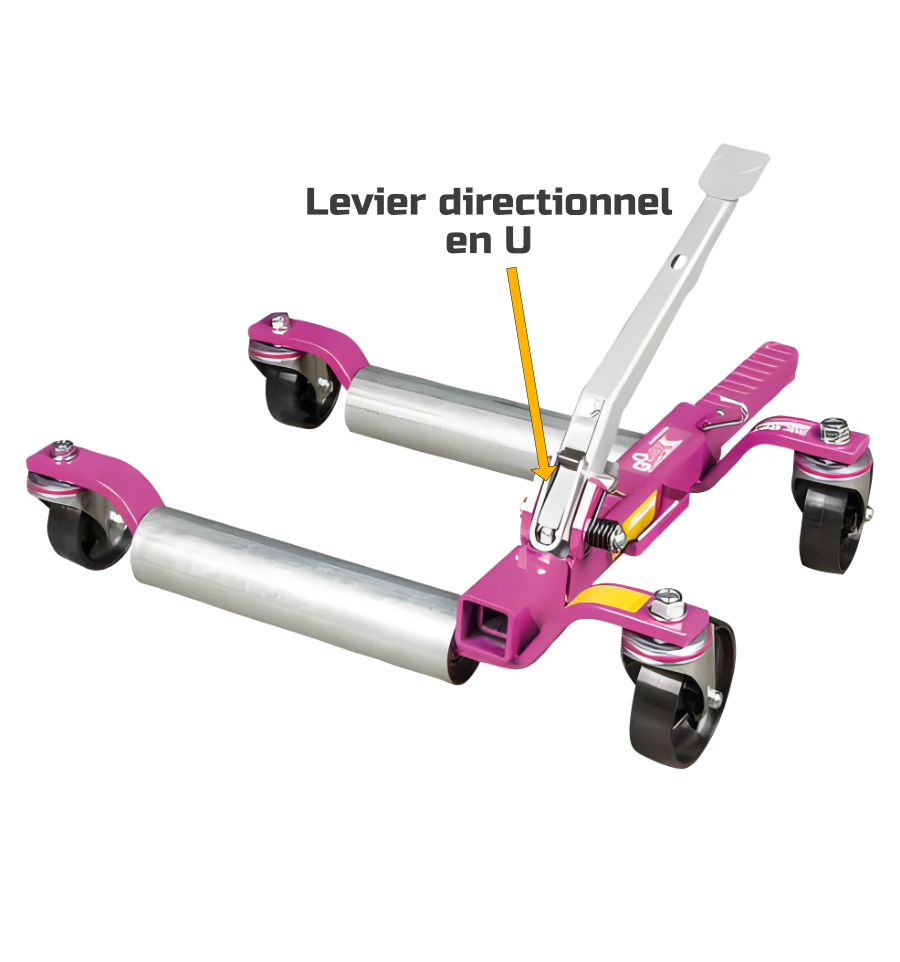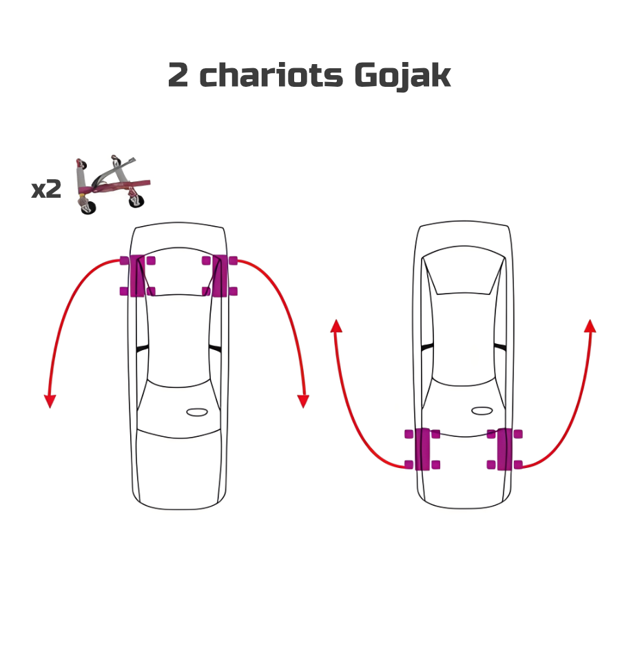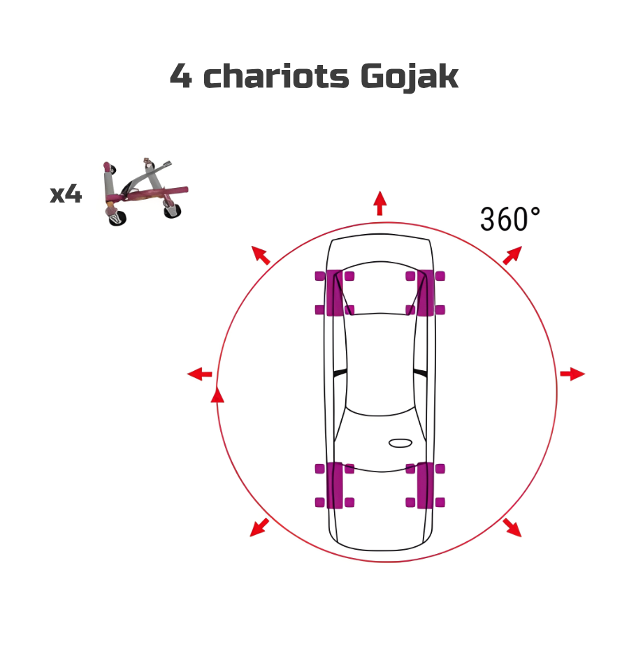 Le Gojak est un chariot à roulettes idéal pour déplacer facilement les véhicules dans les espaces restreints. Fabriqué en acier, il permet de manœuvrer des véhicules même lorsque les roues sont bloquées ou braquées.