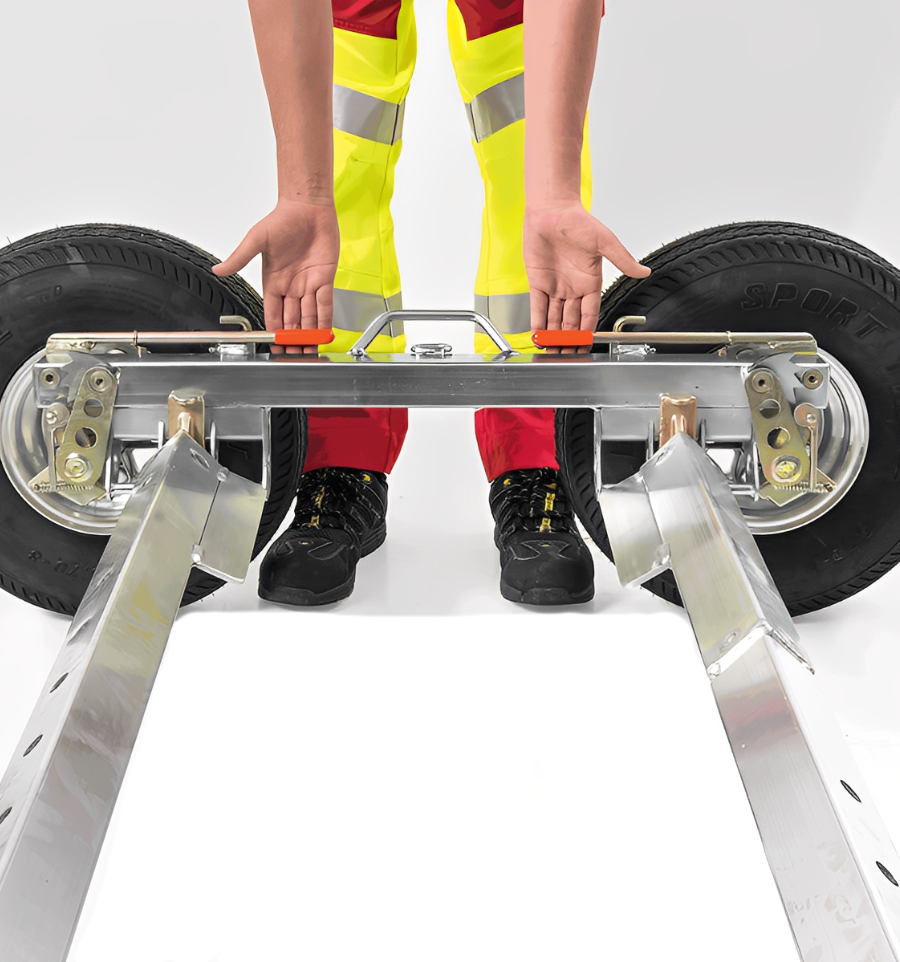 Les deux cadres de roues du chariot dolly se transportent facilement grâce à la poignée centrale.