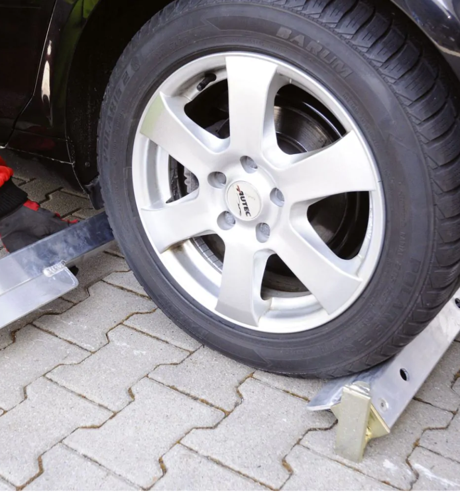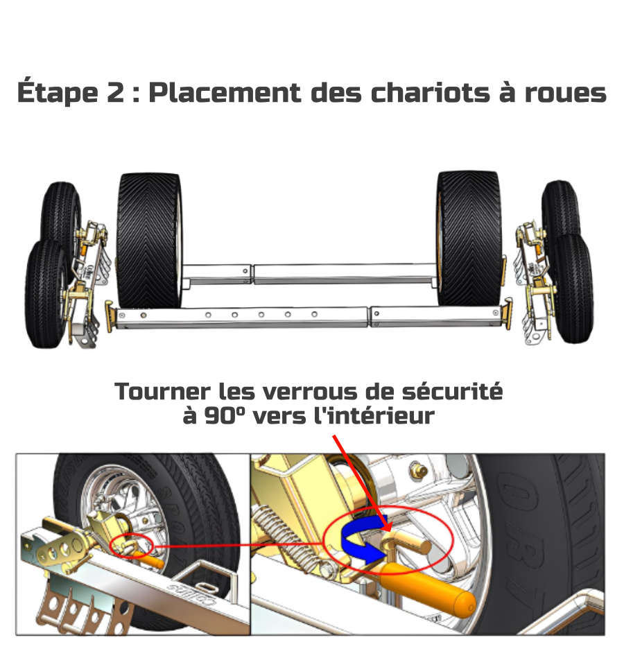 Par la suite, placez les chariots à roues à côté des pneus du véhicule. Des verrous de sécurité sont à tourner vers l'intérieur à 90° pour libérer les roues (étape 2).