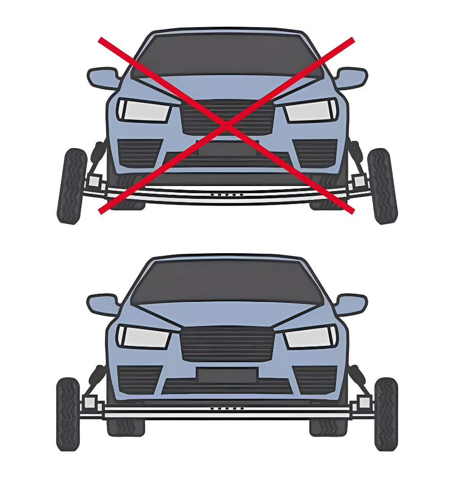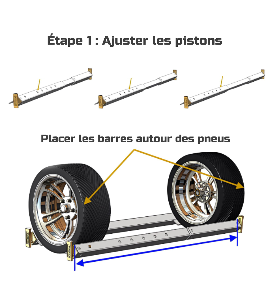 Lorsque cela est fait, il faut placer les 2 barres centrales à l'avant et à l'arrière des pneus du véhicule. Leur longueur doit être réglée au plus près possible des flancs extérieurs des pneus. Assurez-vous que les barres centrales soient parallèles et de la même longueur.