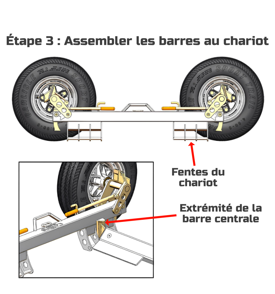 Il faut ensuite assembler les barres centrales aux chariots à roues et pour cela, il faut insérer les extrémités de la barre centrale dans l'une des trois fentes du chariot (étape 3).