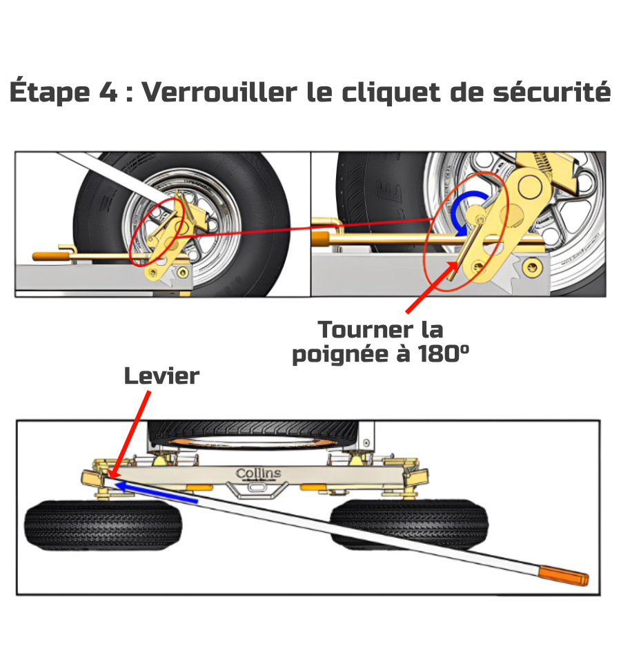 Pour soulever le véhicule, il faut insérer le levier dans l'emplacement prévu à cet effet. Puis, faire levier sur le pneu du chariot en tenant l'extrémité avec les deux mains. Avant de soulever le chariot, vérifiez bien que tous les cliquets de sécurité sont enclenchés.