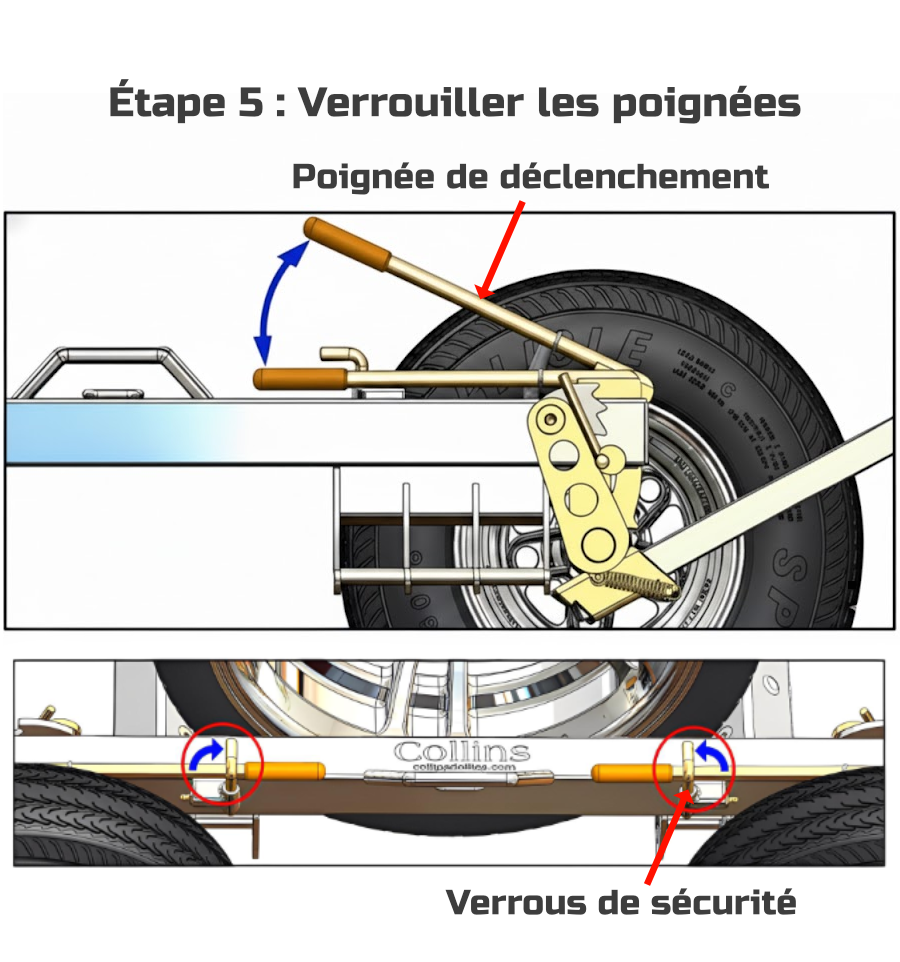 Par la suite, il faut remettre les verrous de sécurité sur les poignées de déclenchement. Chaque cliquet et verrou de sécurité doit rester enclenché pendant le trajet (étape 5).