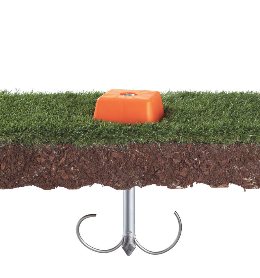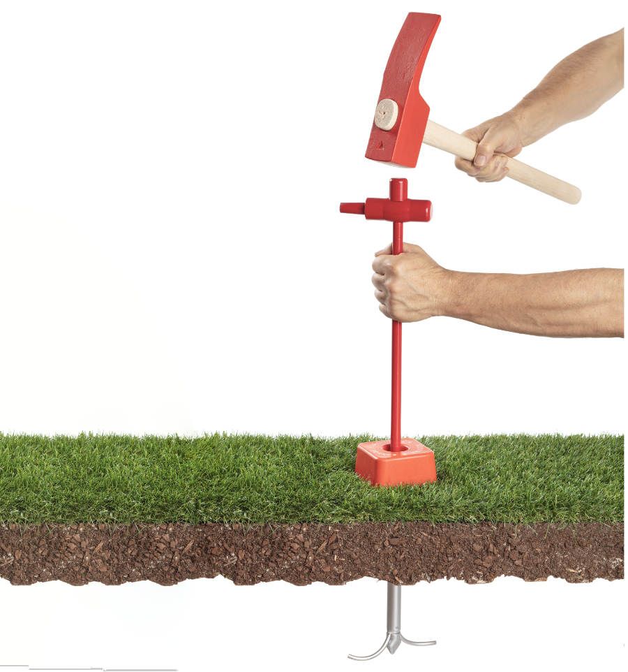 - Placez l'amarre pour borne topo en premier. Son ancrage en pointe s'enfonce solidement dans le sol et se stabilise grâce à ses deux fils latéraux plus larges.