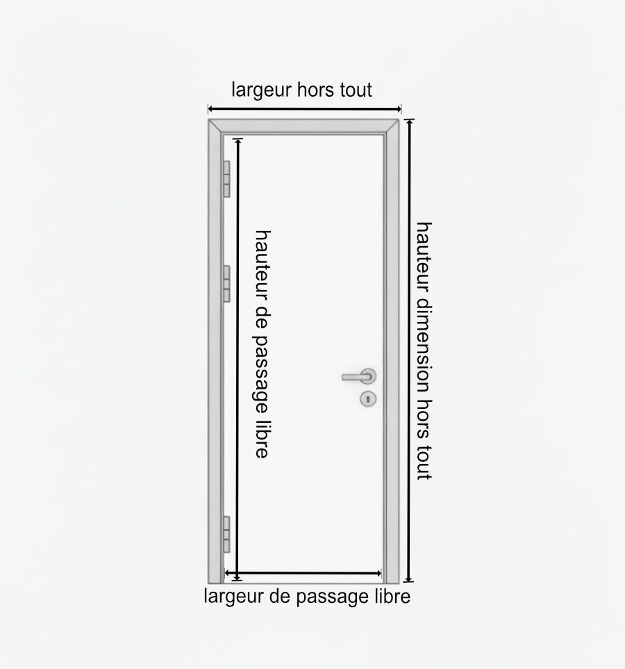 Pour installer une porte de service, il est essentiel de comprendre la différence entre la dimension hors tout et la dimension de passage libre. La dimension hors tout inclut le cadre complet et les éléments de fixation, alors que la dimension de passage libre correspond à l'espace réellement accessible pour passer. Cette différence est importante, notamment dans le cas où vous auriez besoin de faire passer des chariots par cette porte. Il faudra alors tenir compte de la dimension des éléments afin de choisir la bonne dimension de passage tout en prévoyant la dimension hors tout nécessaire à l'installation de la porte de laboratoire.