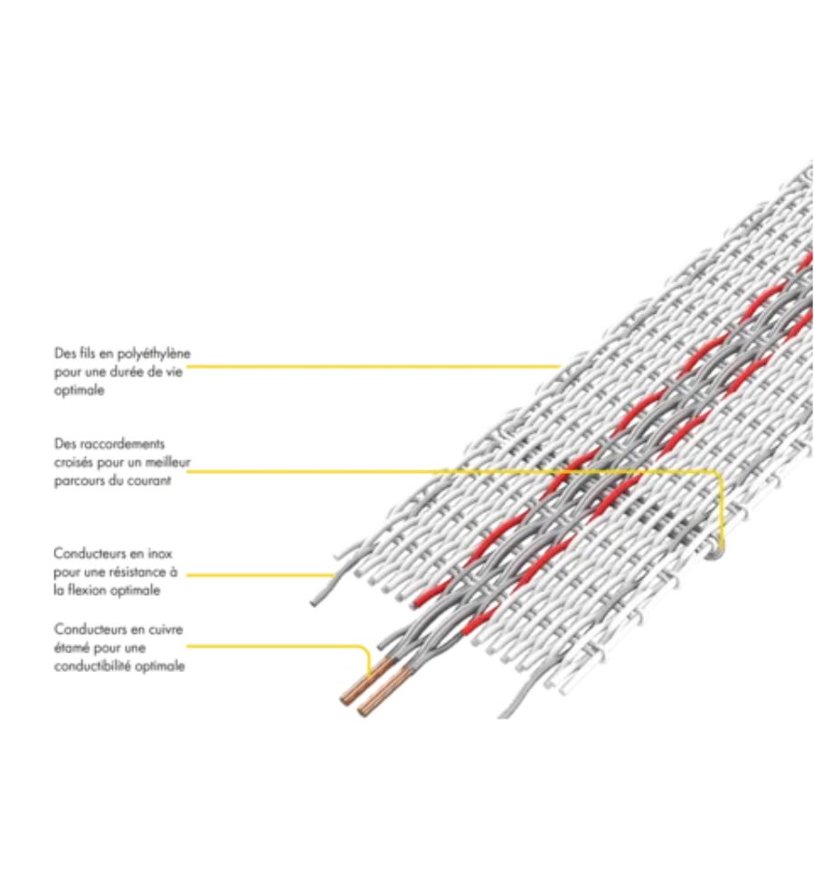 Il est composé de 2 conducteurs cuivre de 0,3 mm de diamètre et 5 conducteurs en inox de 0,2 mm de diamètre.