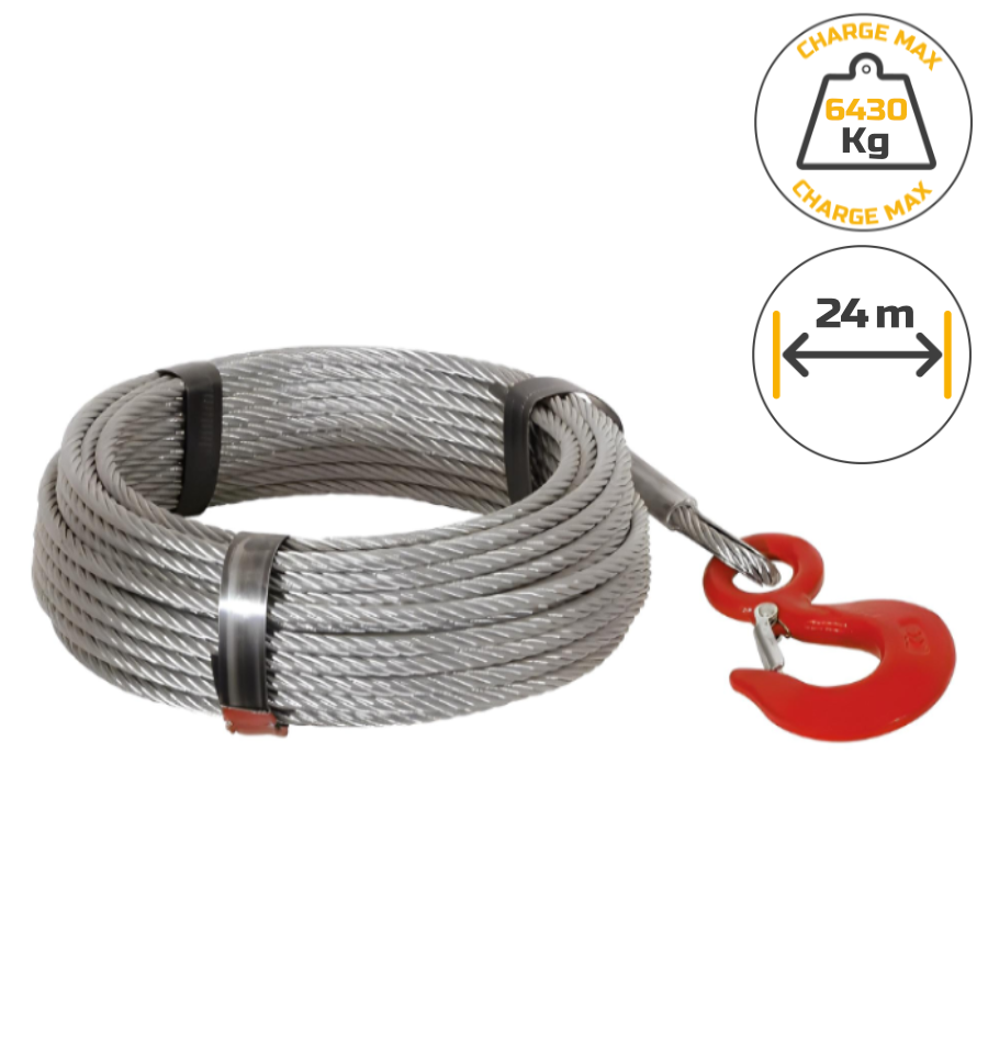 Conçu en acier, notre câble pour treuil dépanneuse s'installe sur des treuils électriques et hydrauliques. Il est équipé d'un crochet de levage avec un linguet de sécurité, assurant un maintien fiable lors de l'intervention.