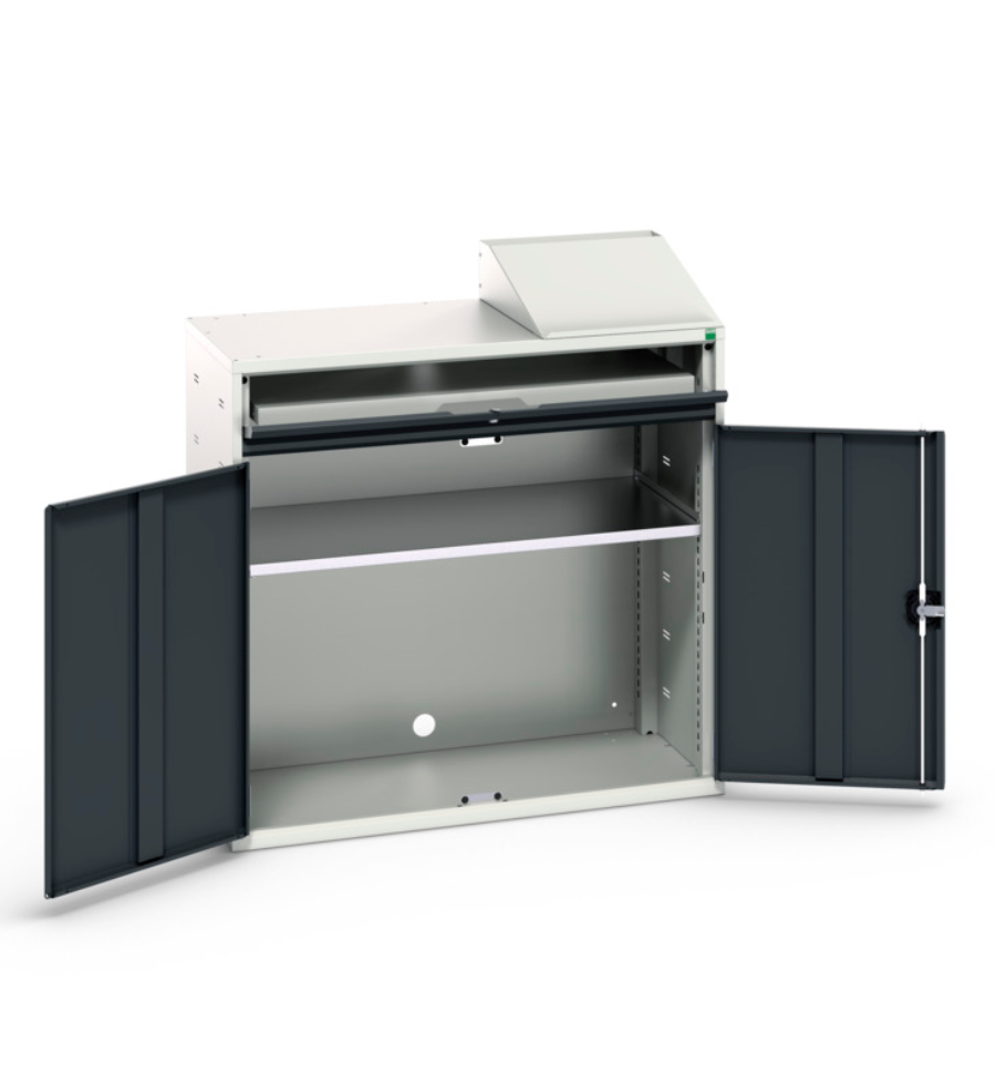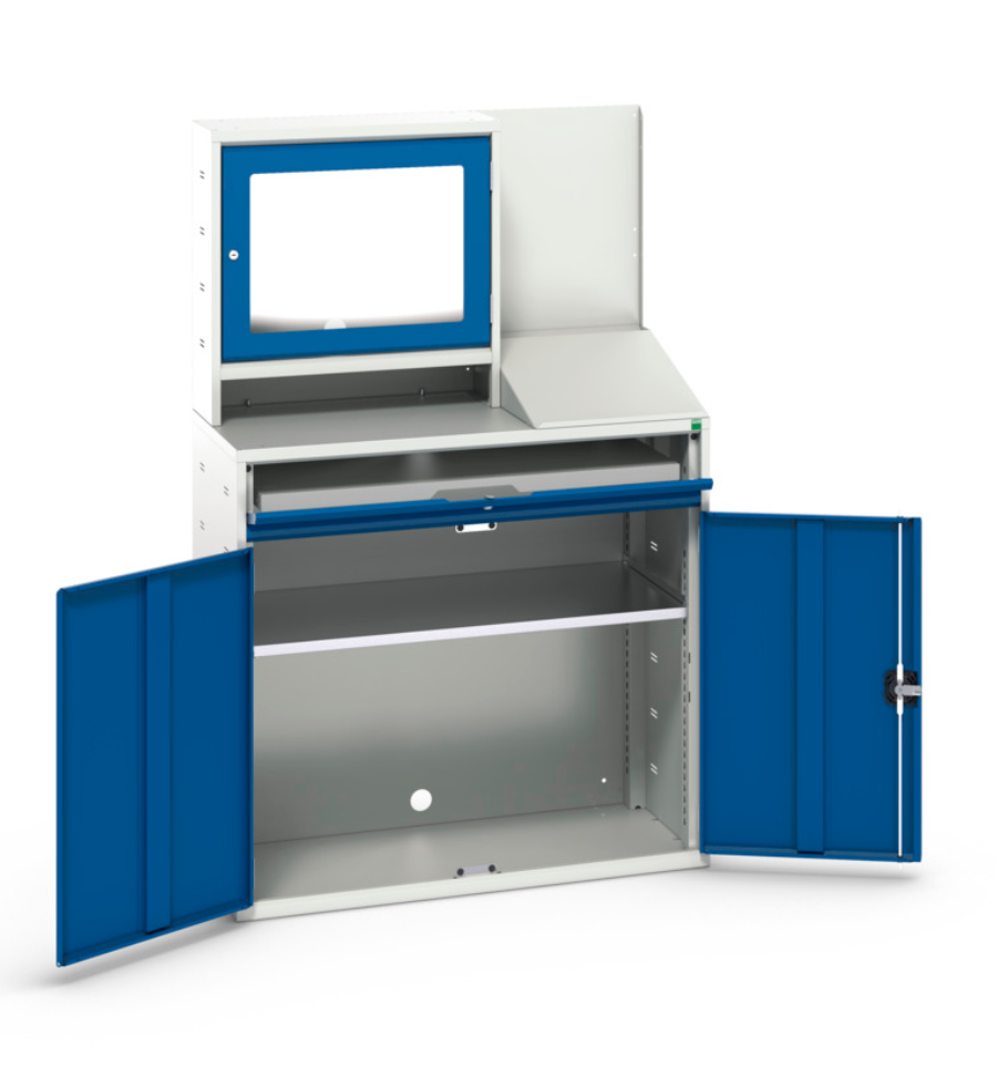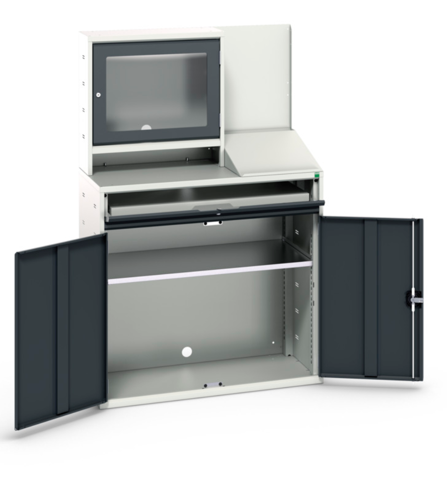L'armoire informatique double, avec ou sans caisson de protection pour écran, sécurise le matériel informatique présent en atelier. Ce type d'armoire en tôle d'acier permet d'installer un poste informatique complet dans un environnement à risque.