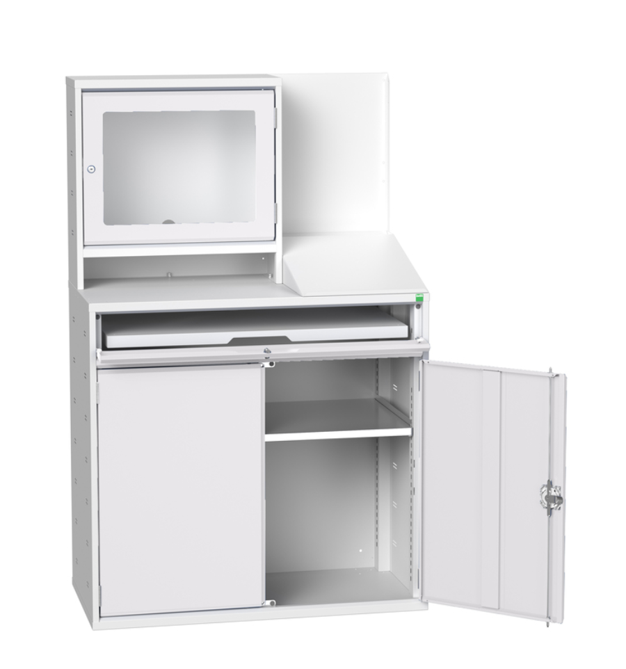 - Une tour de PC, une imprimante et divers matériels ou document dans l'espace de rangement sécurisé incluant une tablette réglable (capacité de charge 75kg).