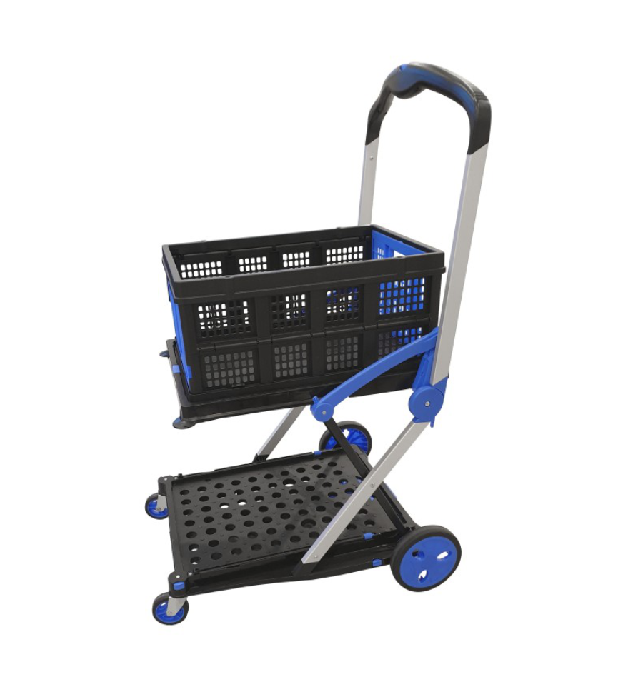Découvrez le chariot porte bac pliable vendu avec un bac repliable de 30 litres. Ses roues (dont deux sont pivotantes) sont également pliables pour un encombrement minimal.