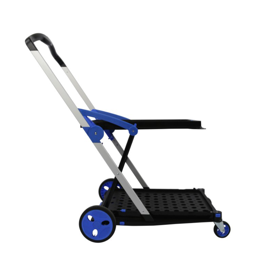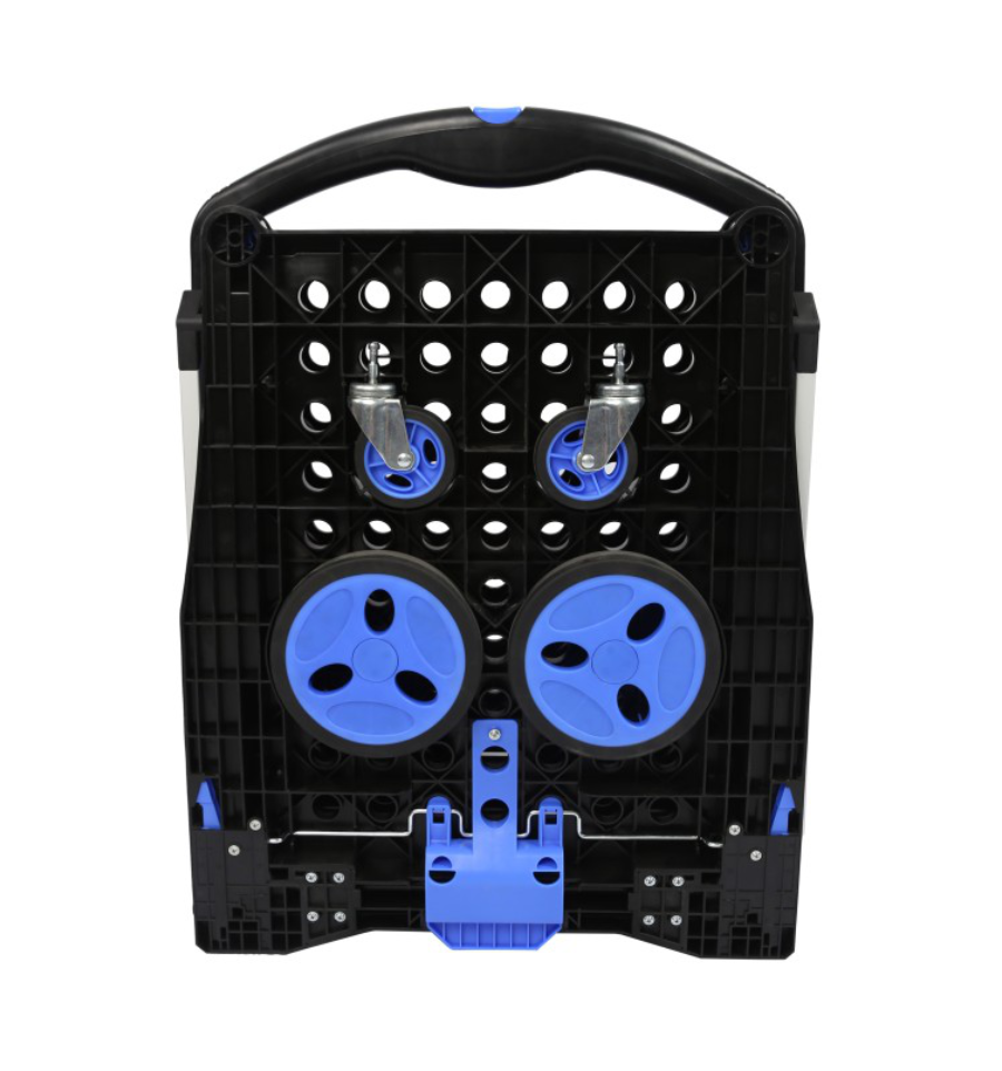 Le chariot de transport pliable est équipé de quatre roues, dont deux pivotantes, qui peuvent également se replier pour un encombrement minimal.