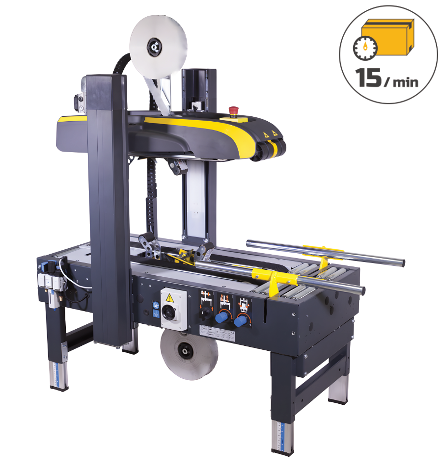 Elle permet de scotcher jusqu'à 15 cartons par minute, soit 900 cartons par heure.