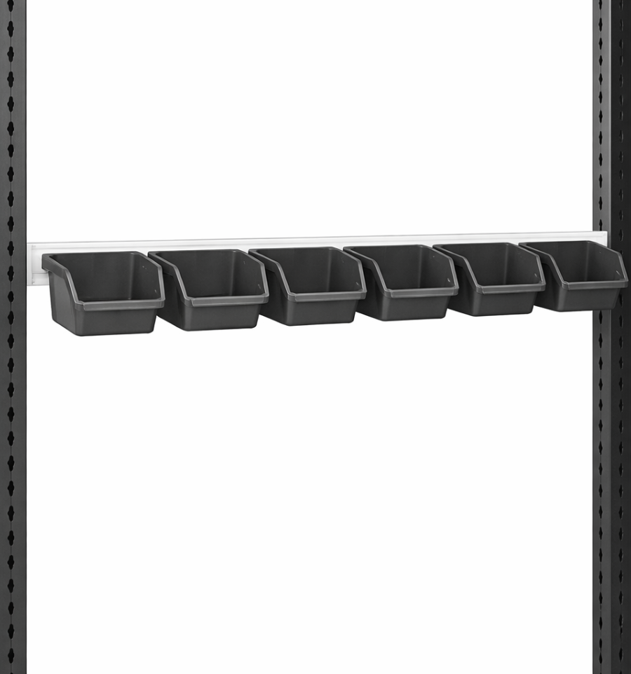 Ce rail est conçu pour recevoir tous types de bacs à bec et se monte directement sur le profil vertical de la structure. Il permet un rangement linéaire, propre et facilement accessible pour les petites fournitures.
