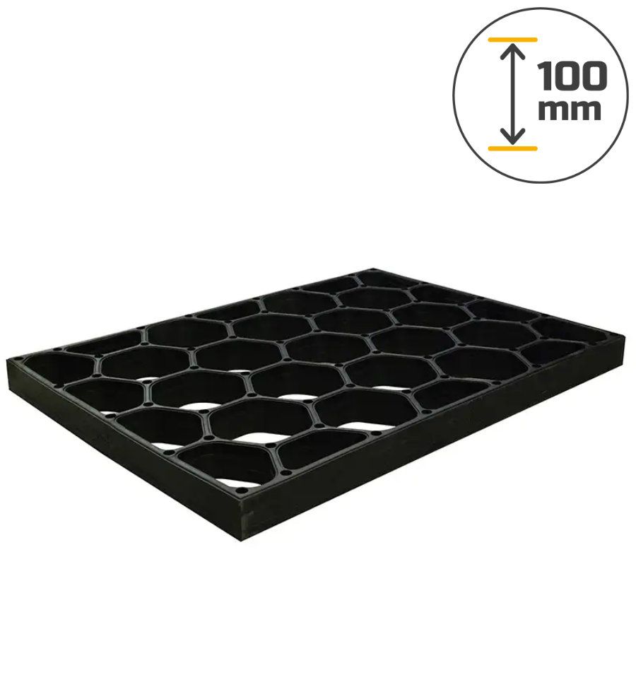 Notre tapis, avec sa forme alvéolée, retient le sable dans le fond de la logette creuse et empêche la formation de trous. Ainsi, vous limitez les pertes.