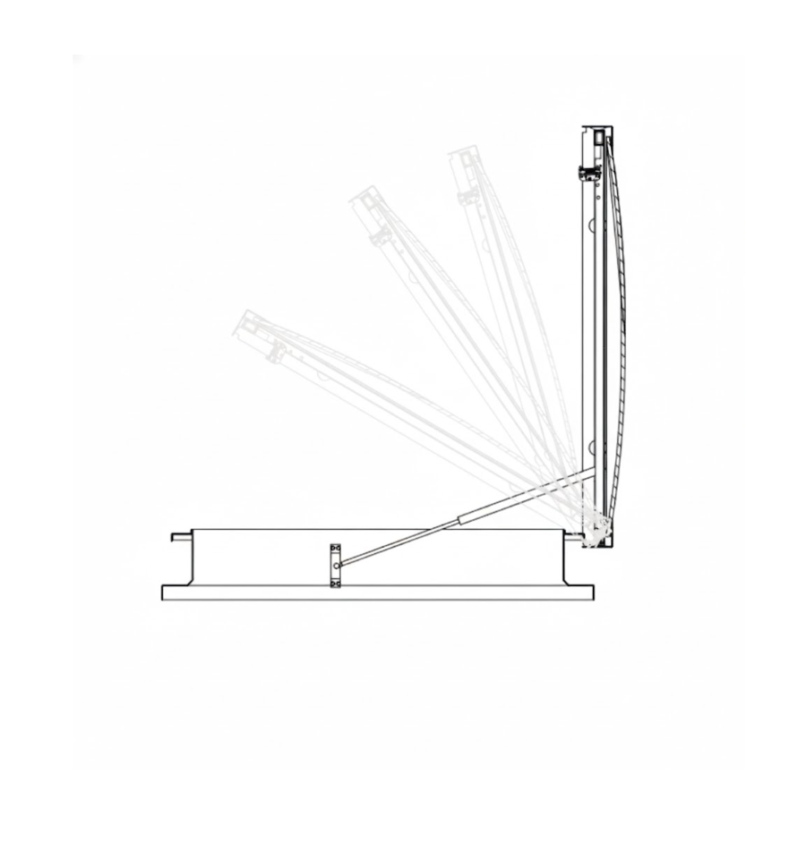 Ce dispositif assure un apport optimal de lumière zénithale couplé à une fonction de ventilation mécanique précise. Son système d'ouverture par vérin oléopneumatique, actionné à distance via un treuil, permet une aération à course variable pour s'adapter parfaitement à vos besoins de confort thermique.
