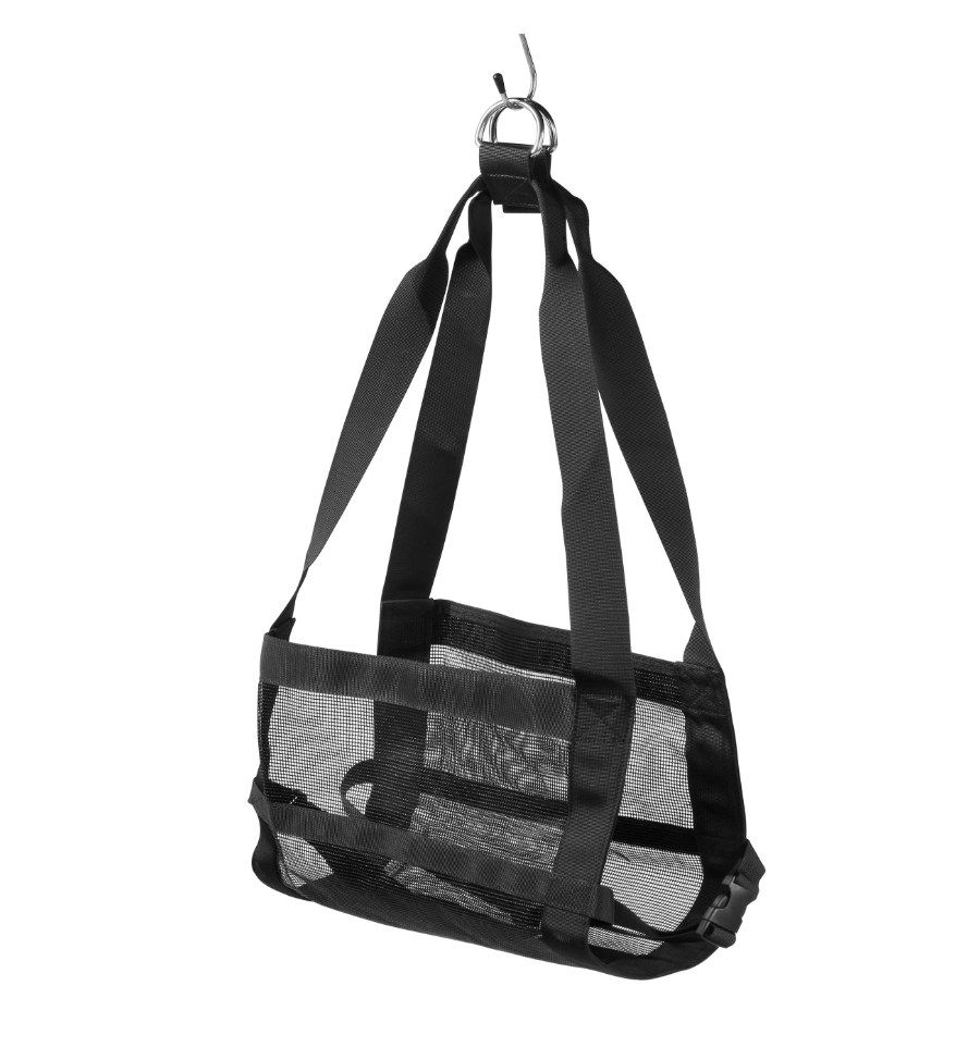 Attachez les sangles réglables ainsi que les boucles de maintien des pattes pour assurer la sécurité des animaux et de l'opérateur. Suspendez l'ensemble via l'anneau métallique sur notre balance, et relevez la mesure.
