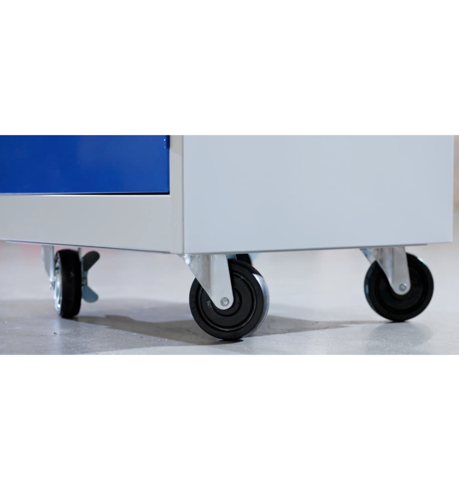 - 4 roulettes de 100 mm de diamètre avec bandage en caoutchouc noir, dont 2 avec freins pour plus de sécurité (NORME EN1757),