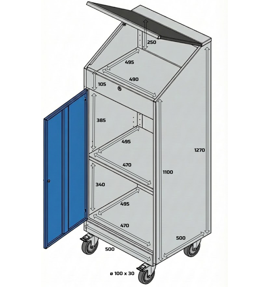 En atelier et en milieu industriel, le pupitre d'atelier mobile permet de consulter des documents et de saisir des rapports de production. Il permet aussi de stocker divers matériels comme des outils, des imprimantes à étiquettes ou des classeurs.