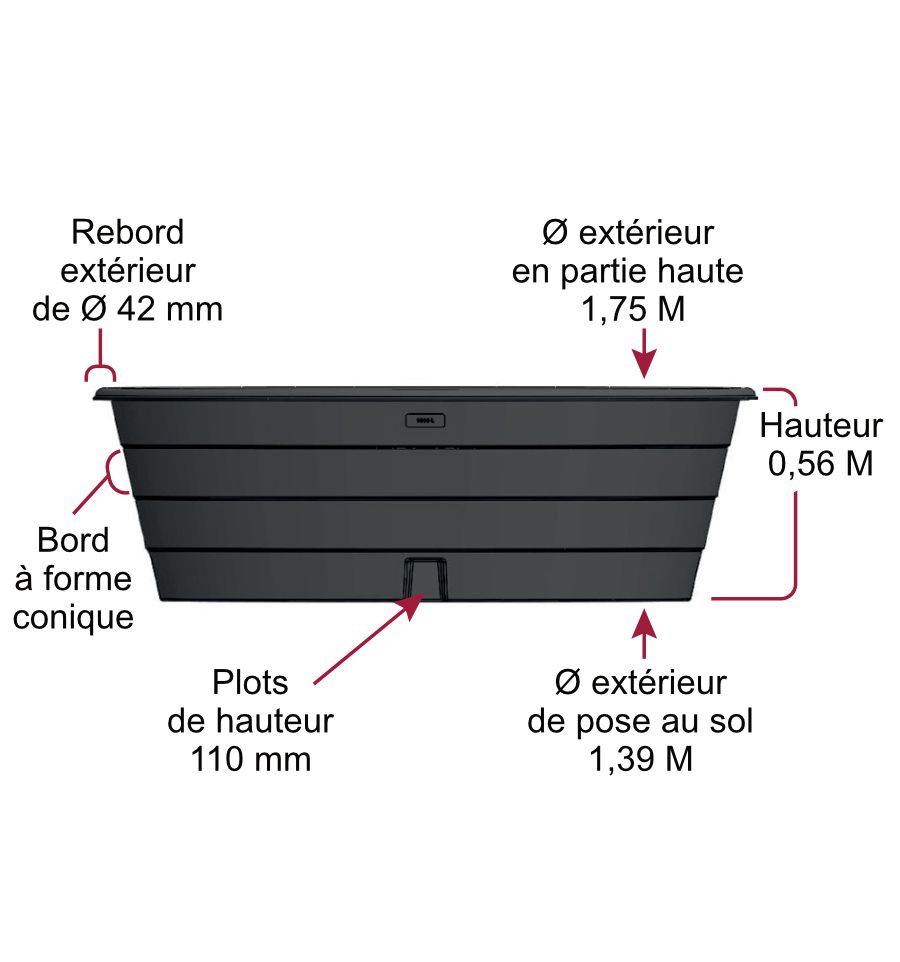 Il mesure Ø175 cm (diamètre du haut) pour Ø139 cm (diamètre au sol), et avec une hauteur de 56 cm.