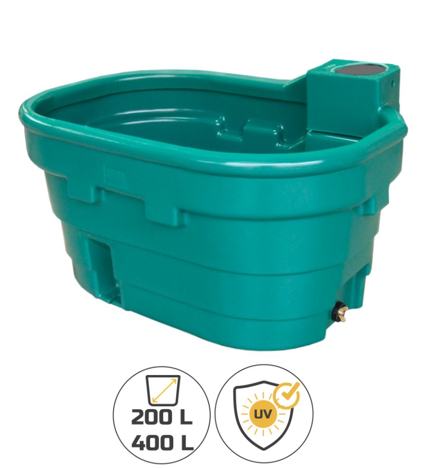 - Le bac de paturage 400L est un bon compromis si vous souhaitez un bon volume d'eau tout en gardant un bac assez compact. Il est idéal pour des petits groupes de chevaux ou bovins.