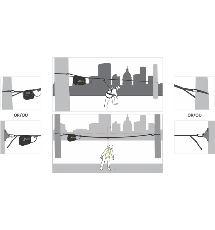 Cette ligne de vie temporaire peut être utilisée à la verticale ou à l'horizontale par rapport à l'installation par deux personnes.
