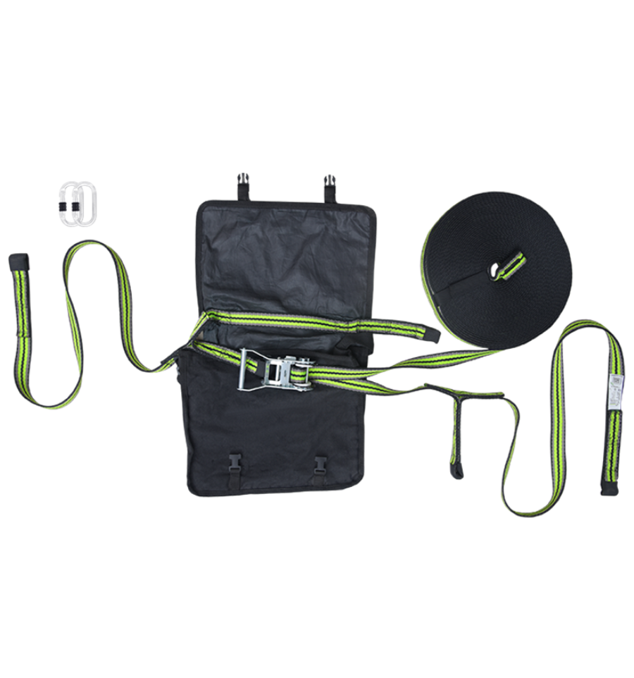Elle est constituée d'une sangle en polyester de 30 mm de largeur qui peut être réglée de 5 à 20 mètres de long. Un sac de rangement indissociable est inclus, permettant de ranger le surplus durant l'utilisation.