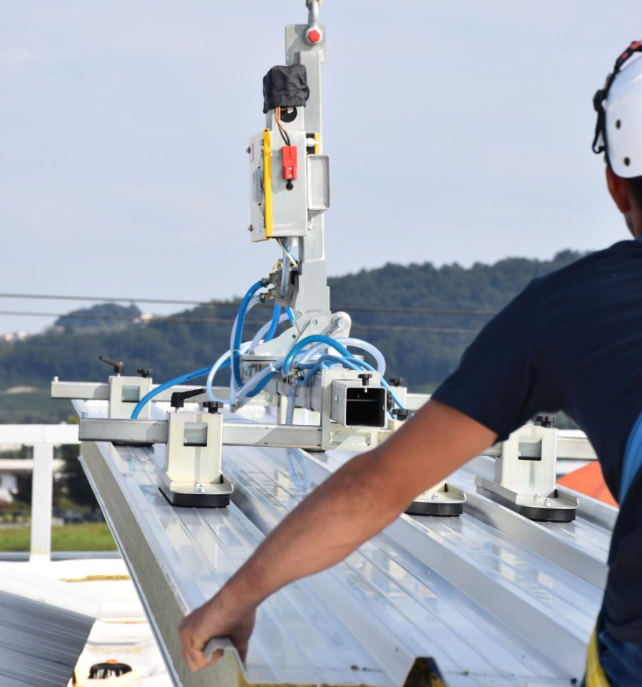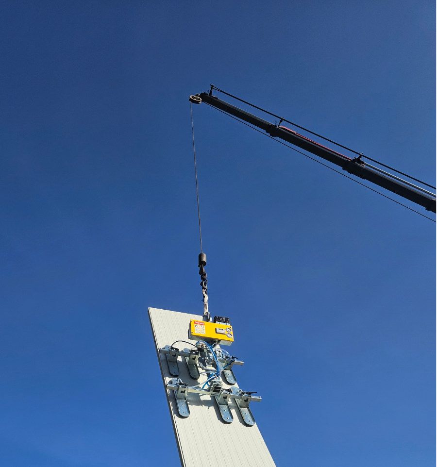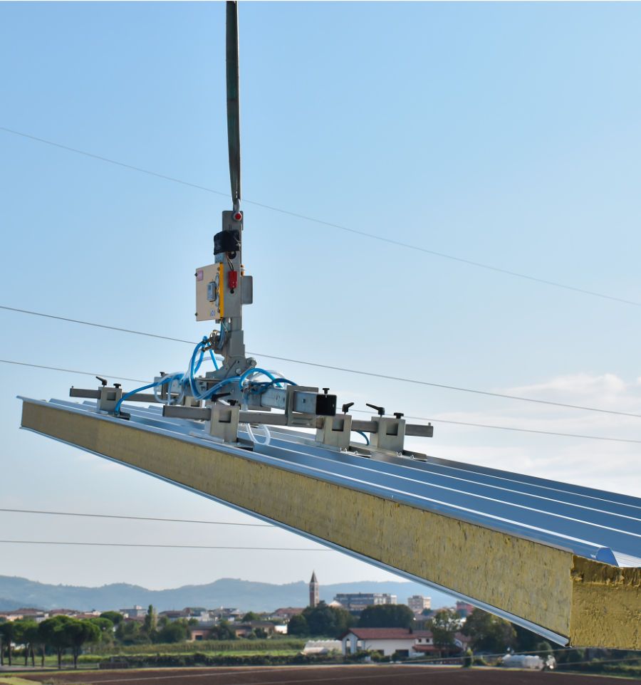 Le palonnier à ventouse garantit une pose de bardage et de couverture rapide, précise et très sécurisée. Ces outils sont spécifiquement conçus pour la manutention de panneaux sandwich (acier, isolant) et de matériaux denses. Nos machines sont compatibles avec les produits des plus grands fabricants de panneaux sandwich.