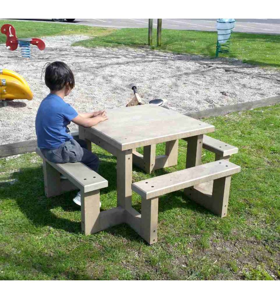 La table de pique-nique pour enfant en plastique recyclé est adaptée en fonction de la taille et de l'école, crèche, maternelle mais aussi primaire.