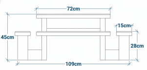 La table pour les crèches mesure 114 et longeur et largeur, 45 cm de haut et pèse 62 KG et est également livrée pré-montée.