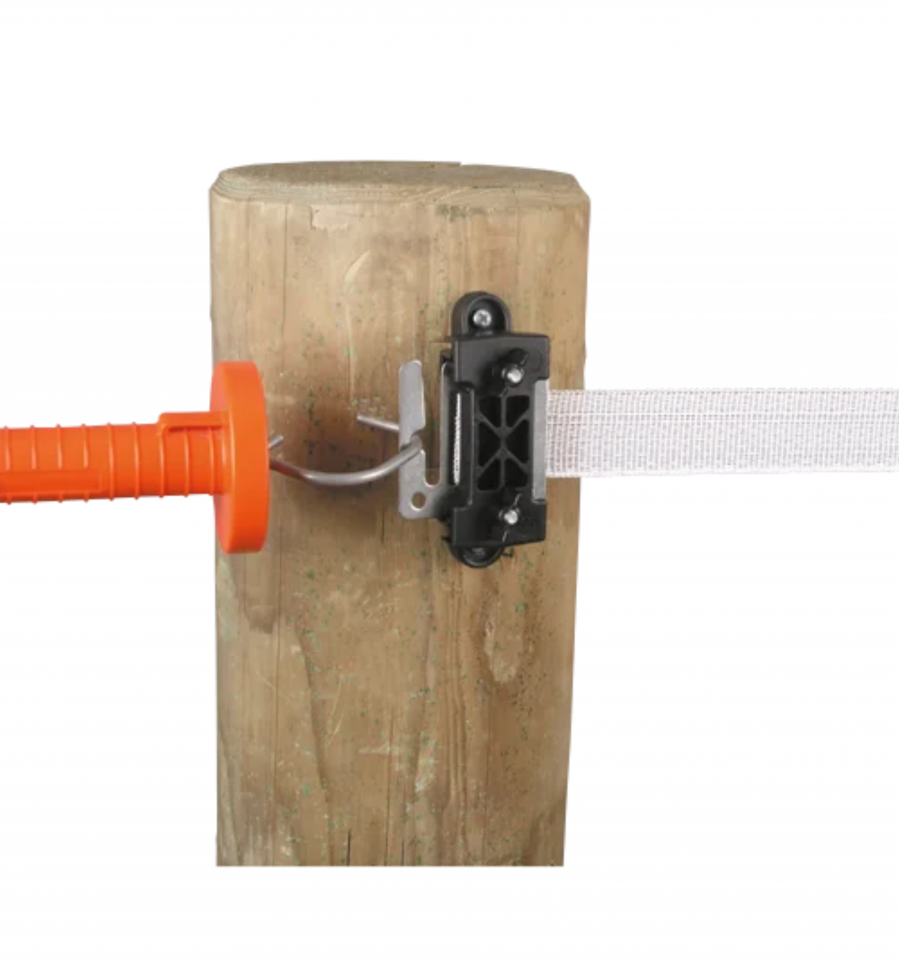 L'isolateur de traction pour ruban se fixe facilement sur des piquets en bois, comme le piquet de clôture en acacia scié et écorcé ou le piquet de clôture en châtaignier scié et écorcé.