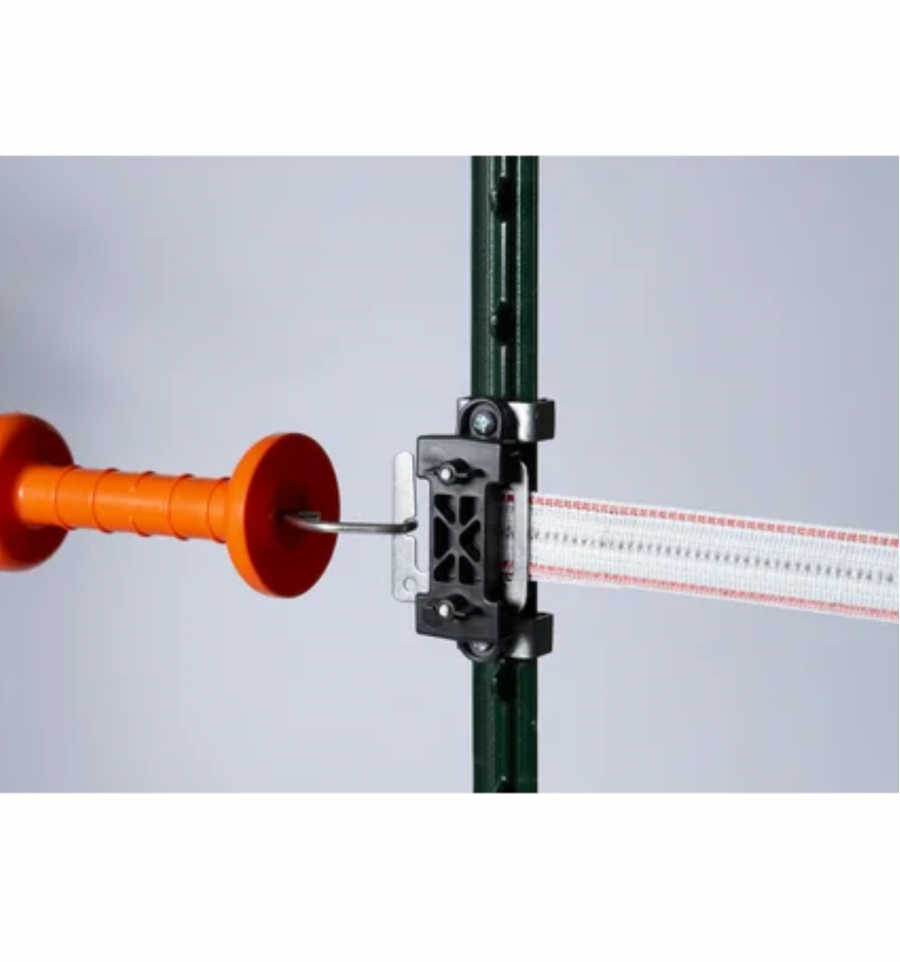 L'isolateur tendeur de coin pour piquet T isole efficacement le ruban électrique tout en encaissant l'ensemble de la pression de la clôture.