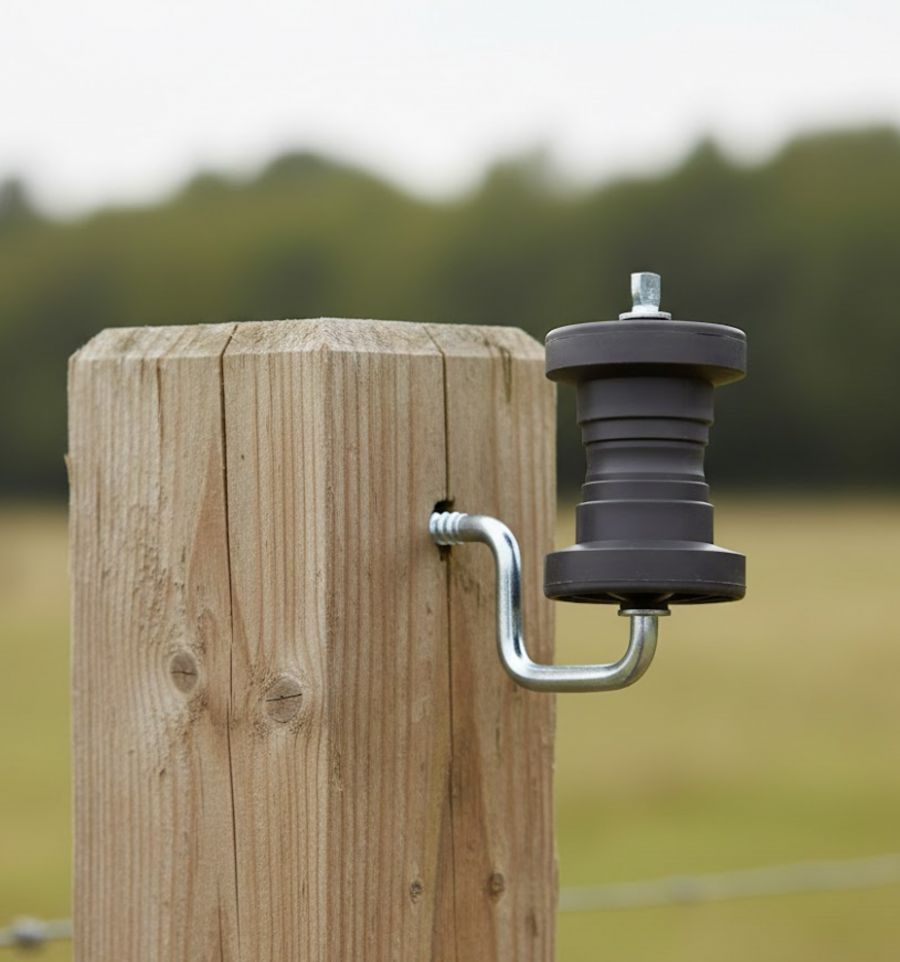 L'isolateur de coin pour ruban se fixe facilement sur un piquet en bois grâce à un filetage à bois.
