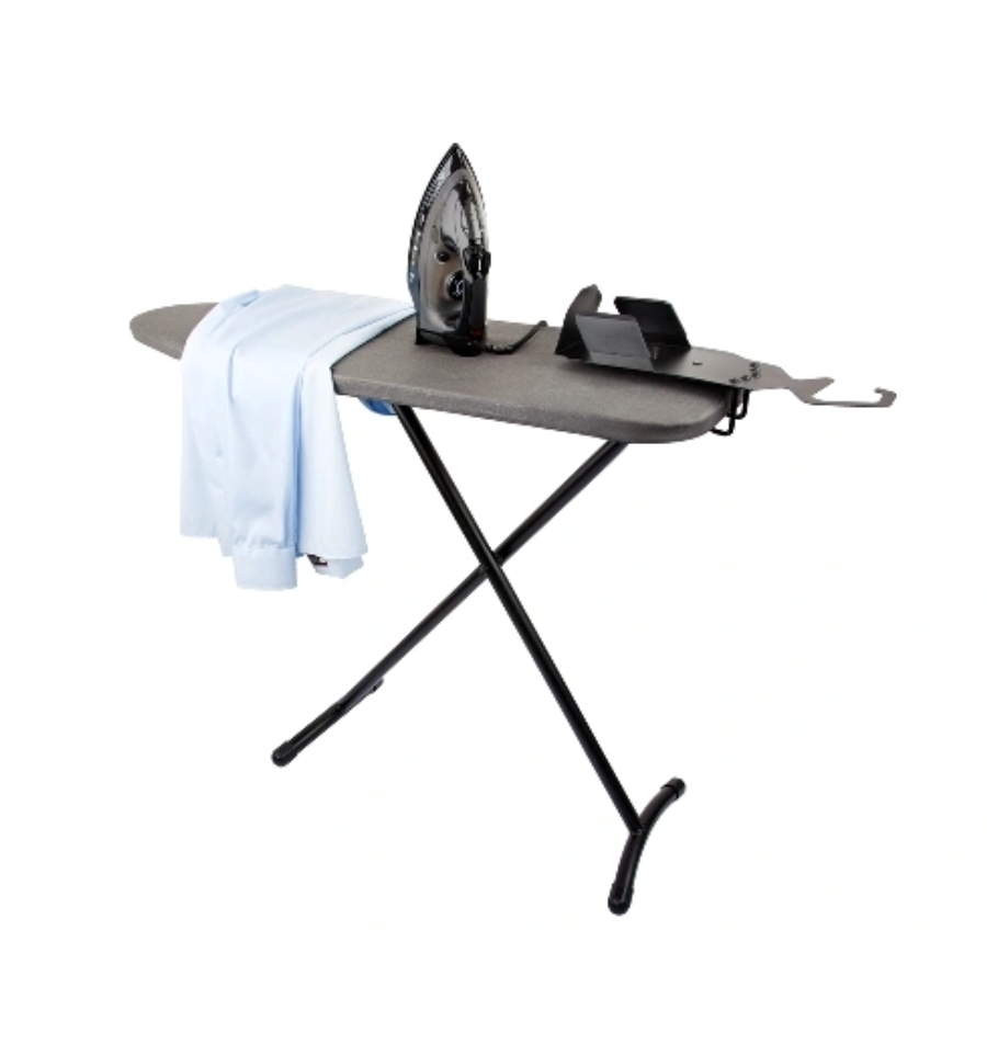 Simplifiez le quotidien de vos clients avec ce centre de repassage complet, incluant fer, table et crochet de rangement intégré.