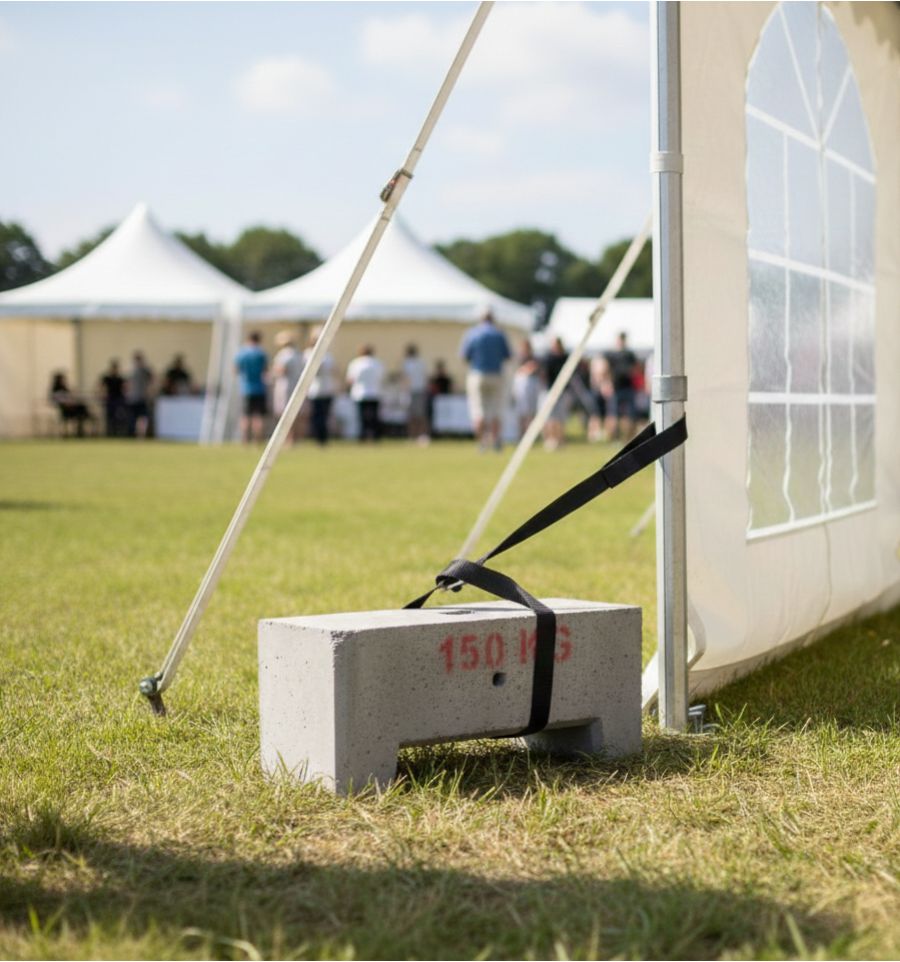 Pour les installations semi-permanentes ou les événements exposés à des risques d'intempéries, ce plot de lestage béton est la solution. Pour une buvette pliante, un poids plus léger peut suffire, mais pour des structures fixes comme un barnum 6x3 professionnel ou un barnum professionnel, il vaut mieux privilégier cette masse en béton.