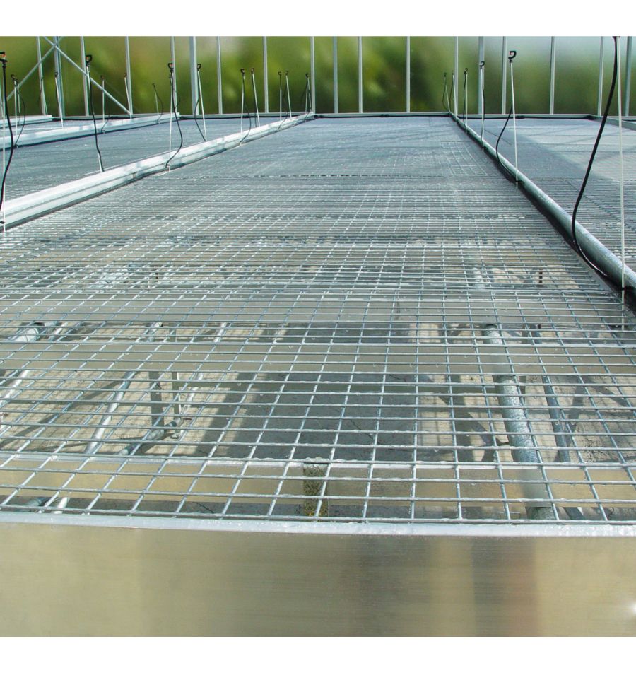 La table de culture grillagée pour serre agricole est conçue avec une structure en grille métallique qui permet un drainage optimal de l'eau.