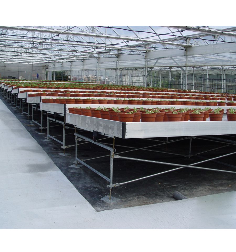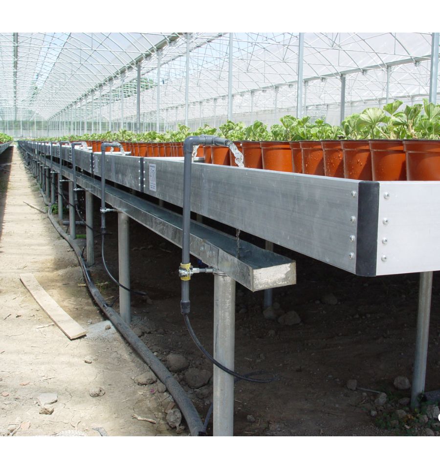 Contrairement à une table grillagée de culture pour serre qui laisse passer l'eau, la table par inondation possède un plateau étanche avec des rainures pour guider l'eau vers le point de vidange.