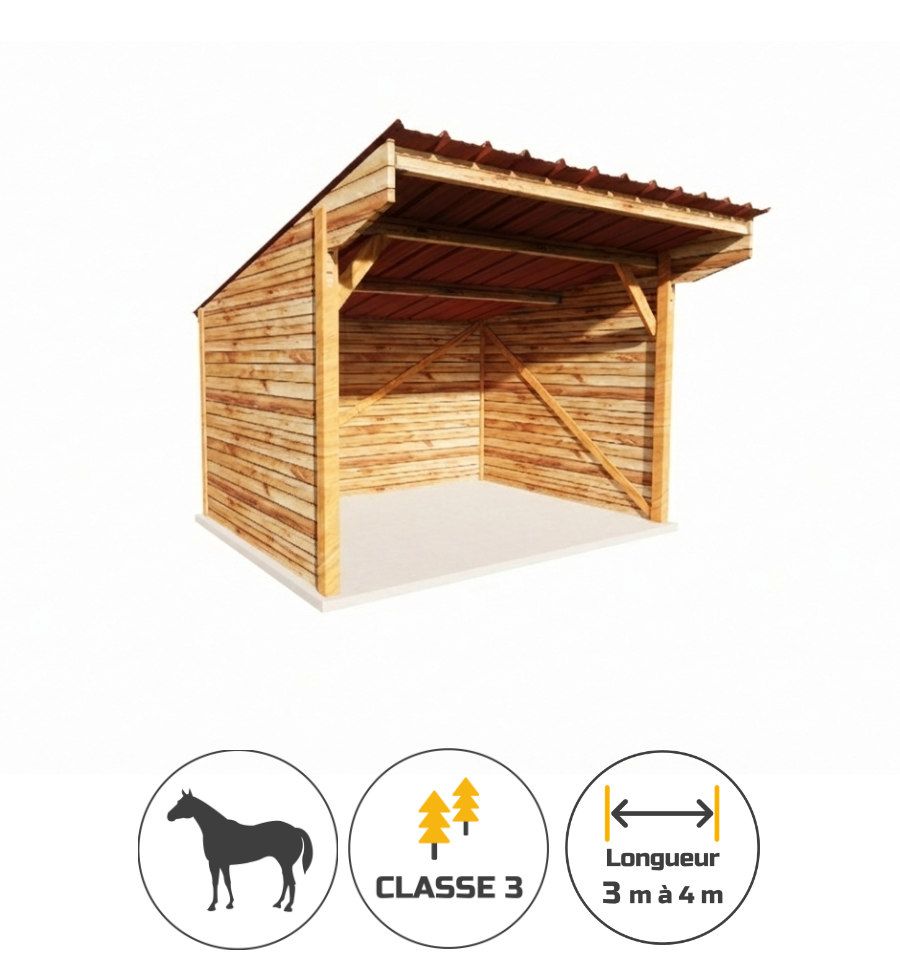 Offrez confort et protection contre les intempéries à vos animaux grâce à notre abri extérieur pour chevaux en bois de dimensions L. 3 x P. 3 m ou L. 4 x P. 3 m.